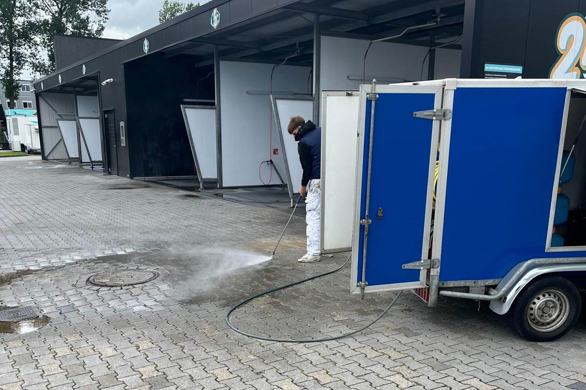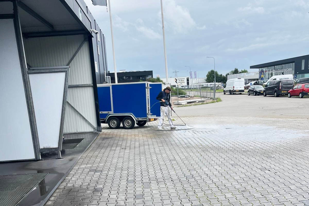 Met onze mobiele installatie kunnen wij efficiënt grote oppervlakken reinigen. Denk aan gevels, muren en andere buitenoppervlakken van bedrijfspanden. Dankzij het gebruik van heet water verwijderen wij vuil, aanslag en algen grondig en milieuvriendelijk.